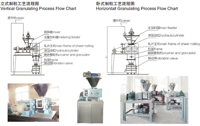 各种干粉物料从设备顶部加入,经脱气、螺旋顶压进入对辊,在对辊的挤压力作用下使物料产生塑性变形而被压缩成片状。片状物料在经过破碎、整粒、筛分等过程,得到颗粒状产品。通过改变辊面开槽方式,可得到片状、条状、扁球状物料。挤压力的大小可根据造粒操作的需要由液压油缸的压力进行调节。