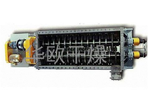 空心轴上密集排列着楔形中空桨叶。单位有效容积内传热面积很大,热介质温度从-40℃到320℃,可以是水蒸气,也可以是液体型:路热水、导热油等。间接传导加热,没有携带空气带走热量,热量均用来加热物料。热量损失仅为通过器体保温层向环境的散热。楔形桨叶传热面具有自清洁功能。物料颗粒与楔形面的相对运动产生洗刷作用,能够洗刷掉楔形面上附着物料,使运动中一直保持着清洁的传热面。桨叶干燥机的壳体为W型,壳体内一般安排二到四根空心搅拌轴。壳体有密封端盖与上盖,防止物料粉尘外泄及收集物料溶剂蒸汽。出料口处设置一挡板,保证料位高度,使传热面被物料覆盖而充分发挥作用。热介质通过旋转接头,流经壳体夹套及空心搅拌轴,空心搅拌轴依据热介质的类型而具有不同的内部结构,以保证较好的传热效果。