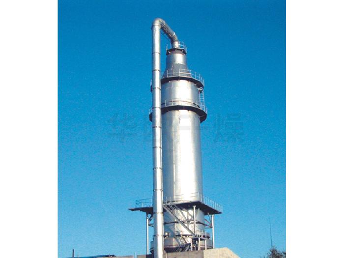 料液通过隔膜泵高压输入,喷出雾状液滴,然后同热空气并流下降,大部分粉粒由塔底排料口收集,废气及其微小粉末经旋风分离器分离,废气由抽风机排出,粉末由设在旋风分离器下的收粉筒收集,风机出口处还可装备二级除尘装置,回收率在96%-98%。