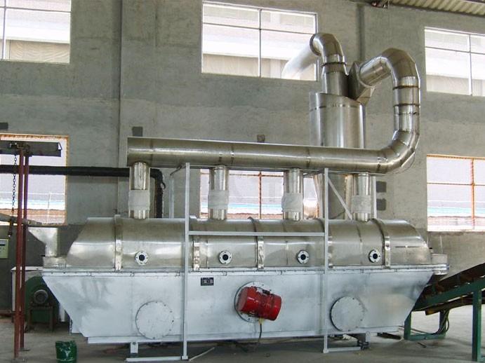 物料自进料口进入机内,在振动力作用下,物料沿水平面流化床抛掷,向前连续运动,热风向上穿过流化床同湿物料换热后, 湿空气经旋风分离器除尘后由排风口排出,干燥物料由排料口排出。